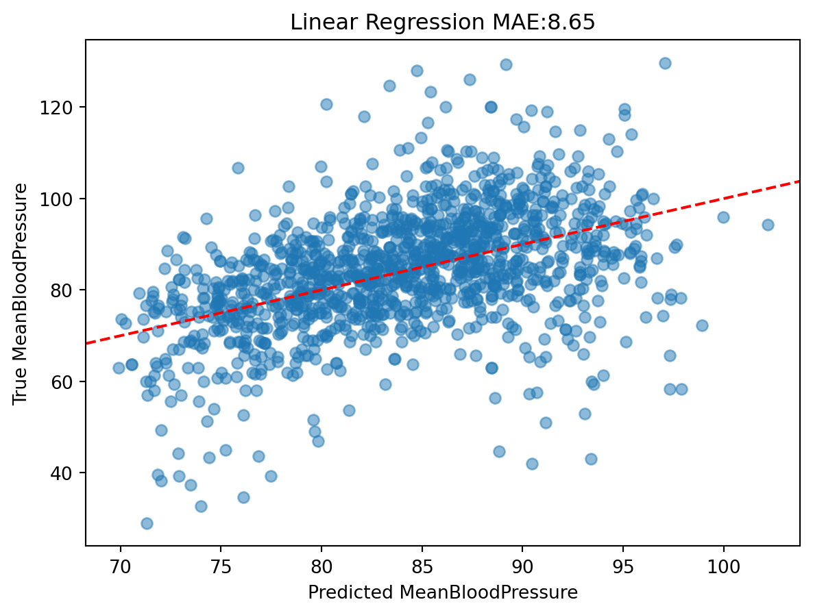 from sklearn.metrics import mean_absolute_errory_test, X_test = model_matrix("MeanBloodPressure ~ Age + BMI + Gender", nhanes_test)y_test_predicted = linear_reg.predict(X_test)test_err =round(mean_absolute_error(y_test_predicted, y_test), 2)test_err