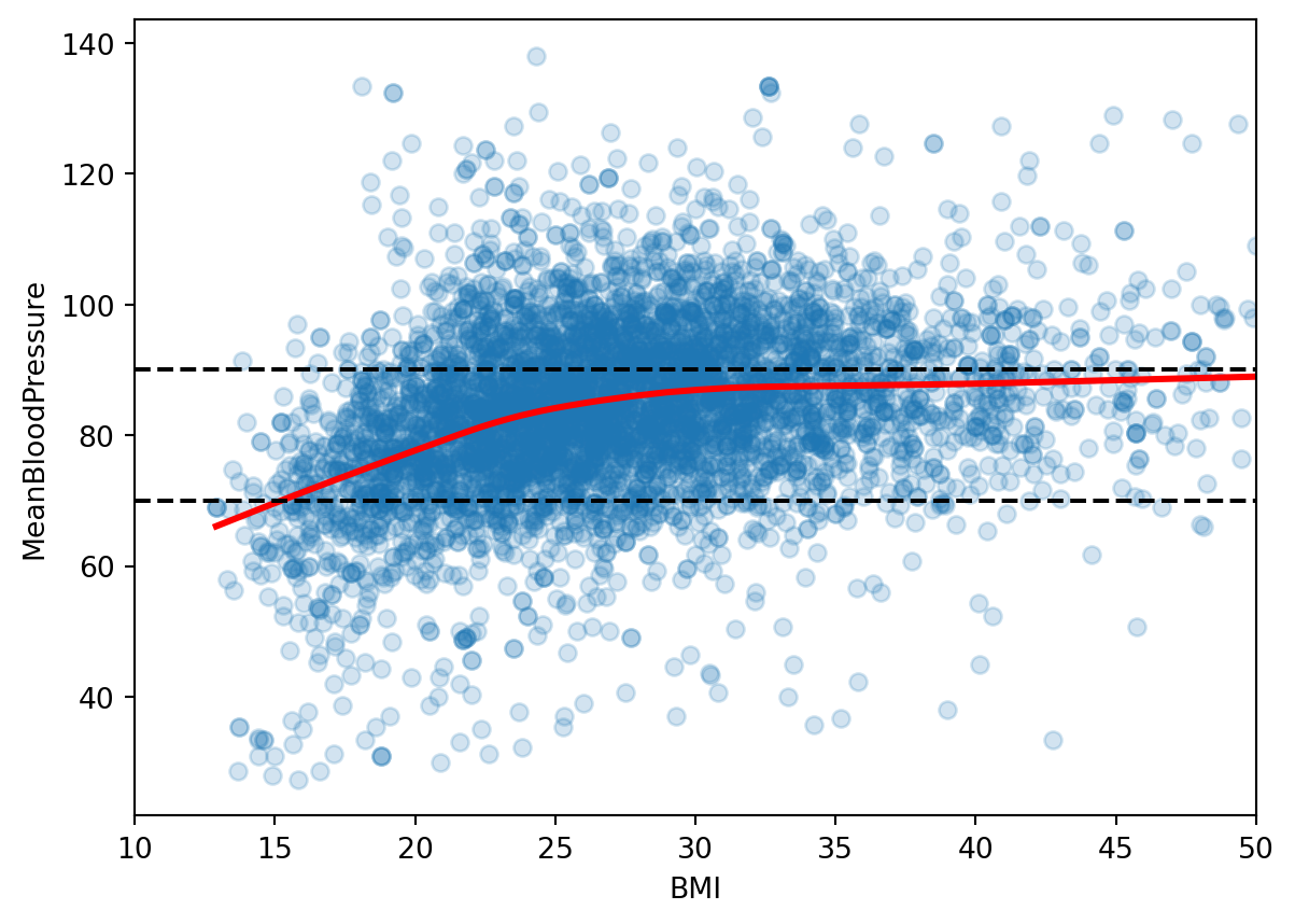Let’s look at the relationship between \(MeanBloodPressure\) and potential predictor \(BMI\). We add a smooth line fit to the scatterplot, because it shows the average trend between these two variables. The black dotted lines are the ranges of healthy mean blood pressure from our response histogram.