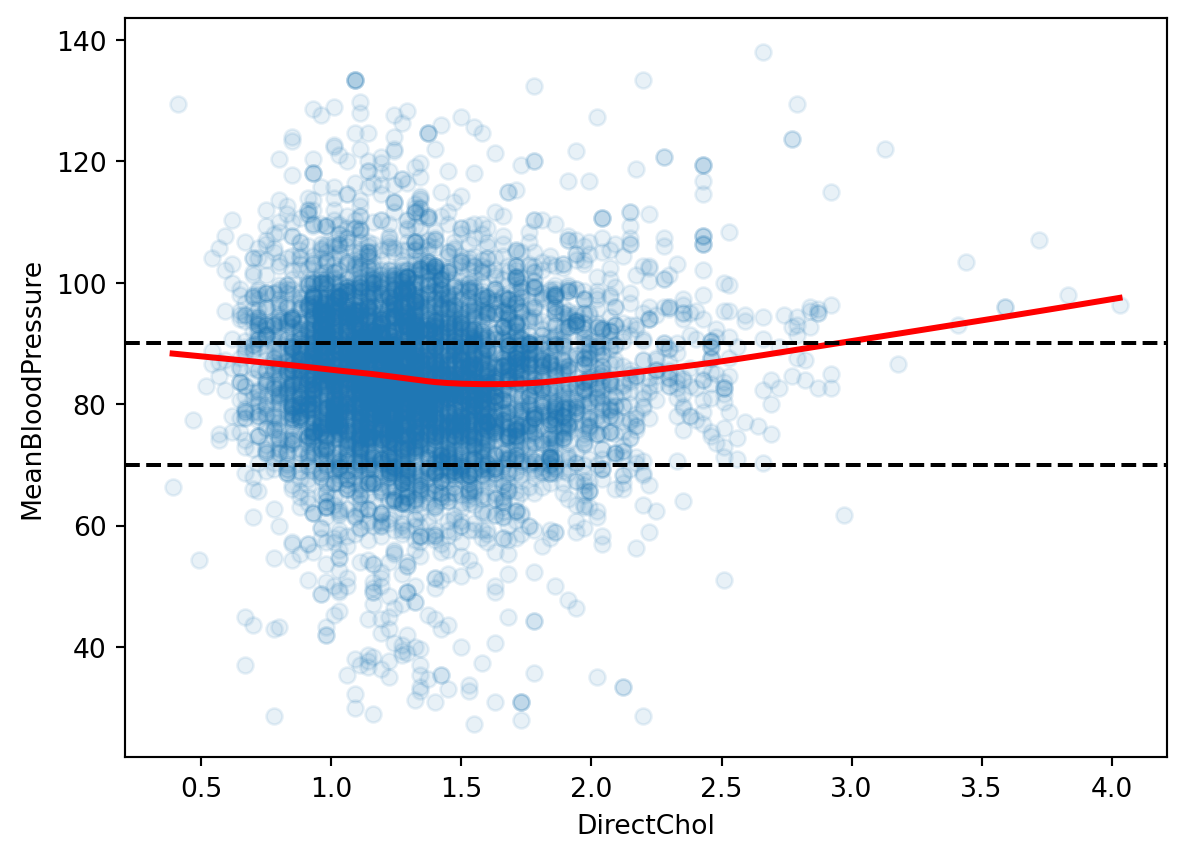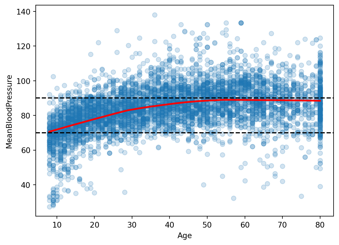 import pandas as pdimport seaborn as snsimport numpy as npfrom sklearn.model_selection import train_test_splitimport matplotlib.pyplot as pltfrom formulaic import model_matriximport statsmodels.api as smnhanes = pd.read_csv("classroom_data/NHANES.csv")nhanes.drop_duplicates(inplace=True)nhanes['MeanBloodPressure'] = nhanes['BPDiaAve'] + (nhanes['BPSysAve'] - nhanes['BPDiaAve']) /3plt.clf()g = sns.displot(x="MeanBloodPressure", data=nhanes)g.refline(x=70, color='r', linestyle='--')g.refline(x=90, color='r', linestyle='--')plt.show()