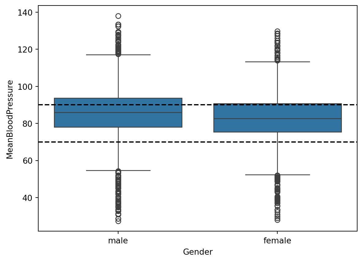 We see that the \(MeanBloodPressure\) is fairly symmetrically distributed. A person has normal blood pressure if their \(MeanBloodPressure\) is between values of 70 and ~90, which we have shown in the dotted vertical lines. There seems to be more people with elevated blood pressure, as there are more counts above 80 than below 80.