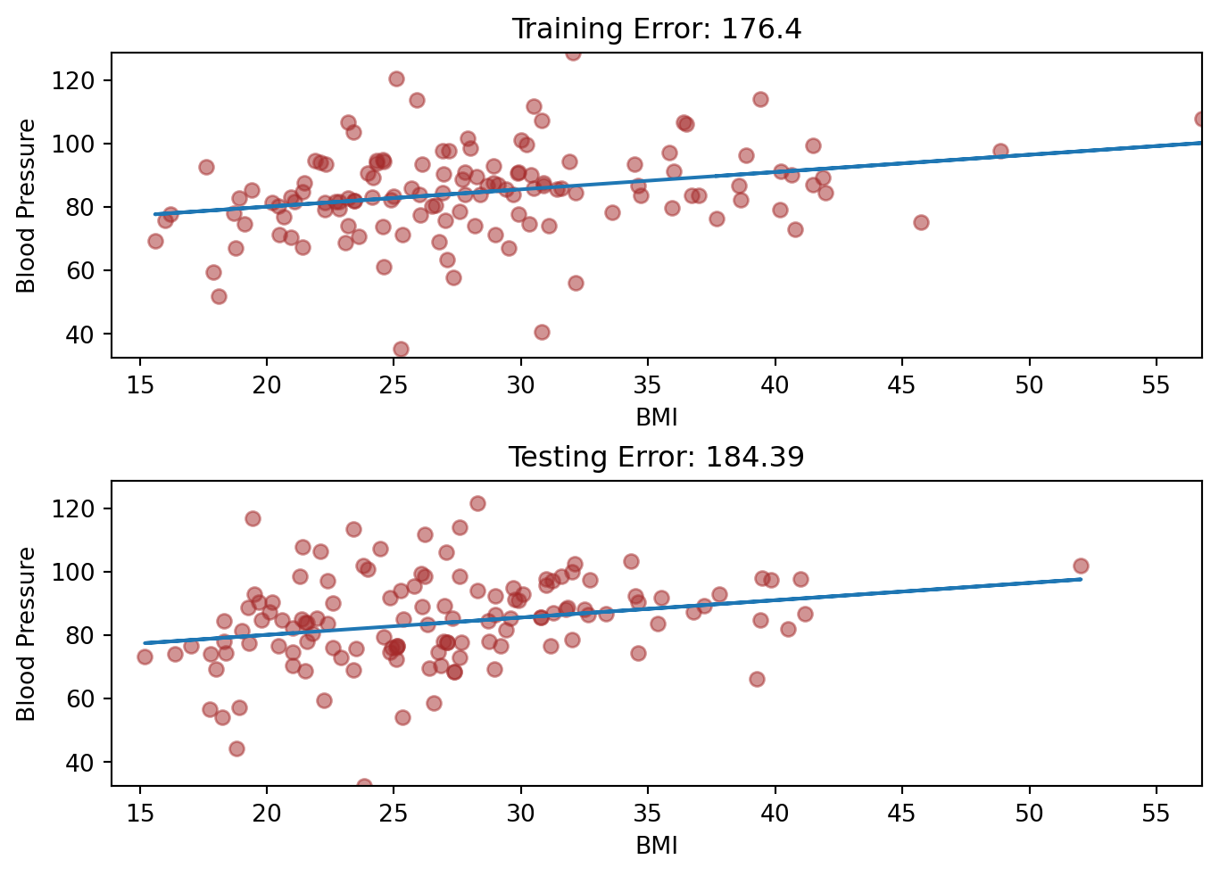 y, X = model_matrix("BloodPressure ~ BMI", nhanes_tiny)X_train, X_test, y_train, y_test = train_test_split(X, y, test_size=0.5, random_state=42)linear_model = sm.OLS(y_train, X_train).fit()linear_model.summary()