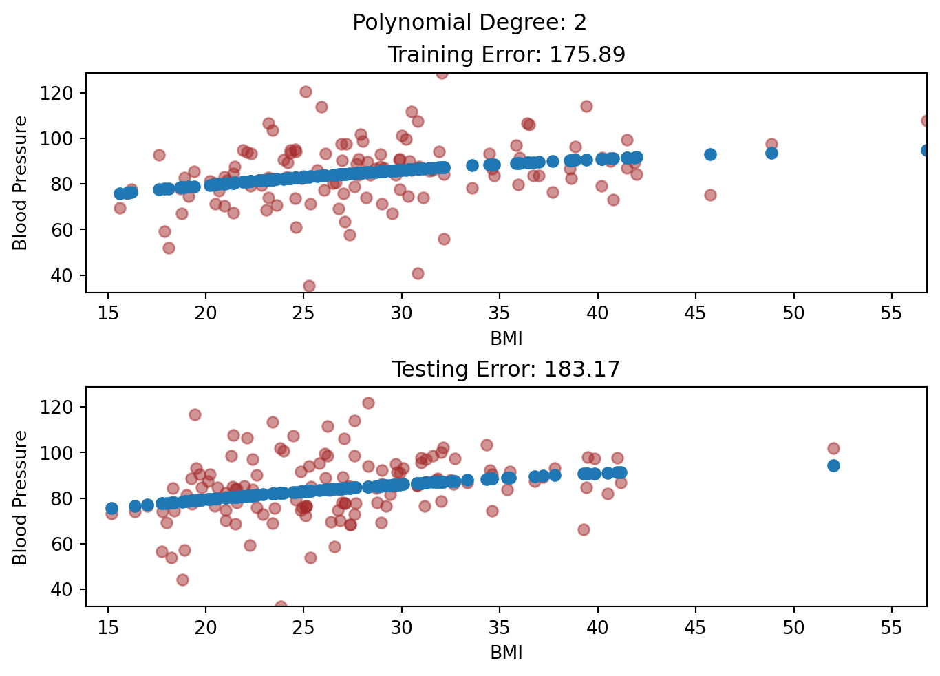 In the linear model, we see that the Training Error is fairly high, and the Testing Error is even higher. This is an example of Underfitting, where our model failed to capture the complexity of the data in both the Training and Testing Set.