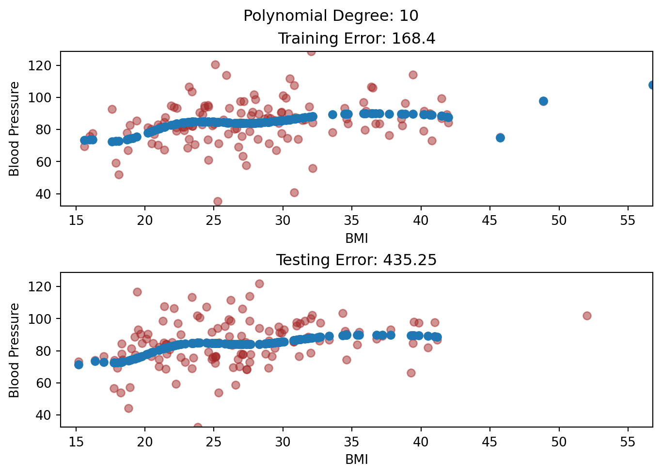 After degree 6, we see that the Training Error is low, but the Testing Error is huge! This is an example of Overfitting, in which our model fitted the shape of of the training set so well that it fails to generalize to the testing set.