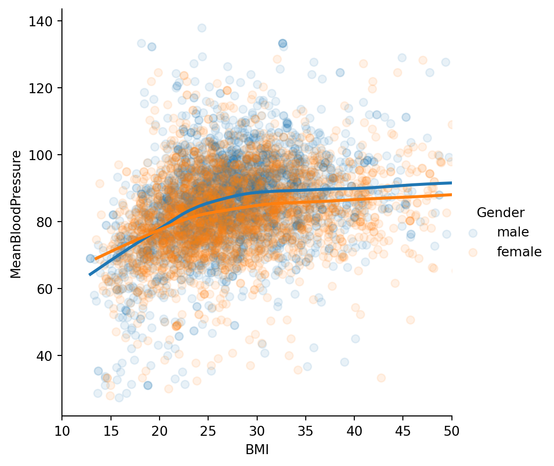import pandas as pdimport seaborn as snsimport numpy as npfrom sklearn.model_selection import train_test_splitimport matplotlib.pyplot as pltfrom formulaic import model_matriximport statsmodels.api as smnhanes = pd.read_csv("classroom_data/NHANES.csv")nhanes.drop_duplicates(inplace=True)nhanes['MeanBloodPressure'] = nhanes['BPDiaAve'] + (nhanes['BPSysAve'] - nhanes['BPDiaAve']) /3nhanes_train, nhanes_test = train_test_split(nhanes, test_size=0.2, random_state=42)plt.clf()ax = sns.regplot(y="MeanBloodPressure", x="BMI", data=nhanes_train, lowess=False, scatter_kws={'alpha':0.2}, line_kws={'color':"r"})ax.set_xlim([10, 50])plt.show()
