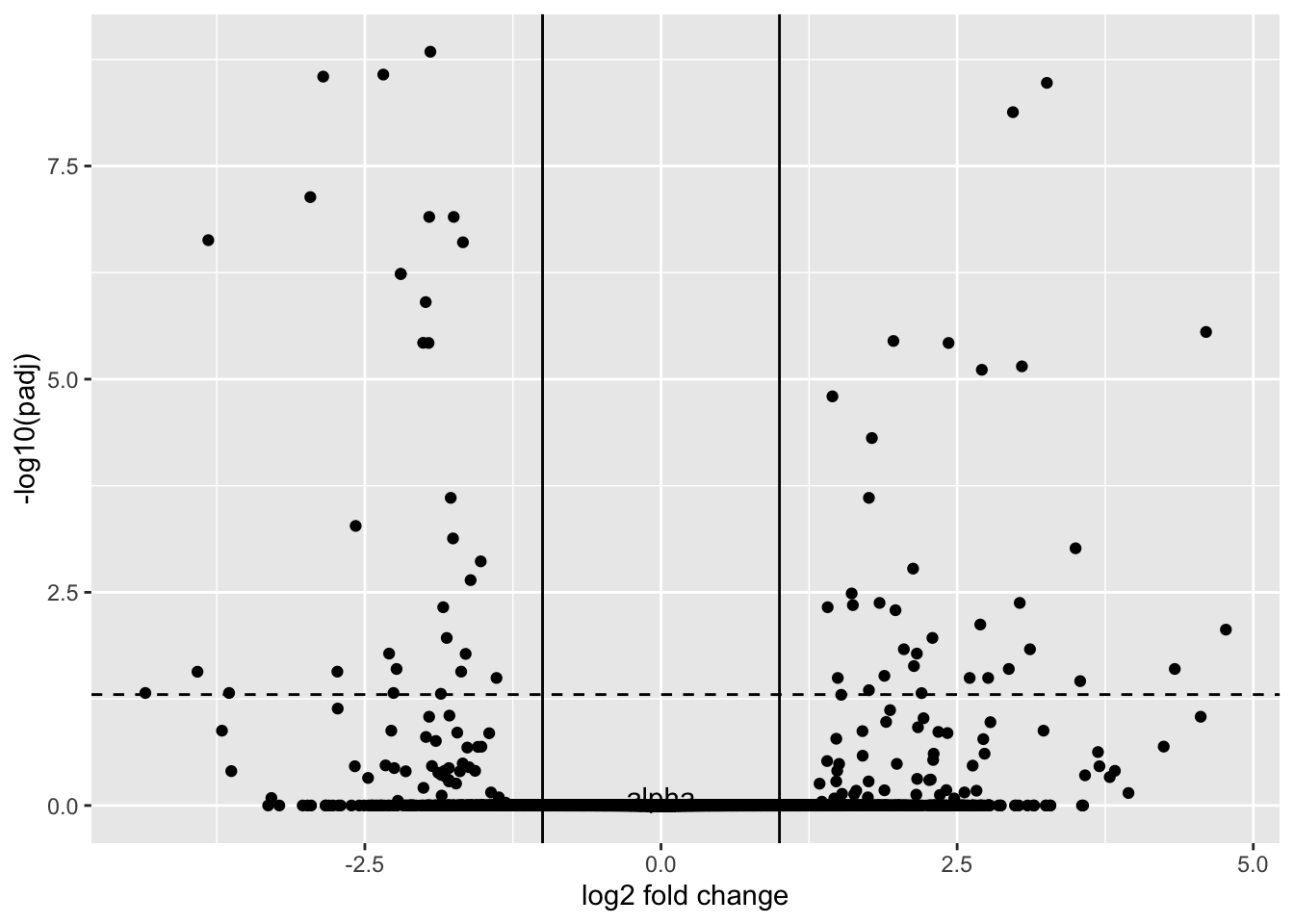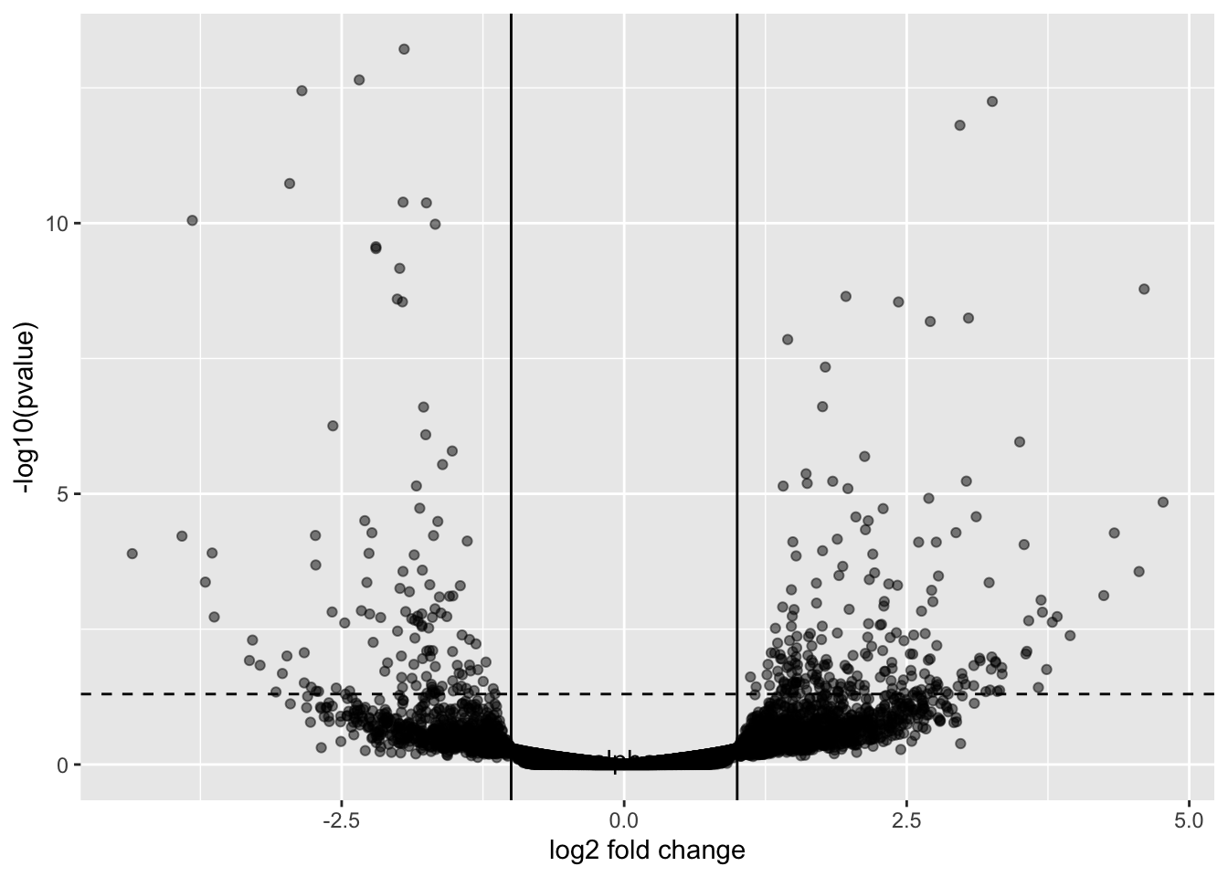 geom_point(aes(y=-log10(pvalue), x=log2FoldChange), color="black", alpha=0.5) +
