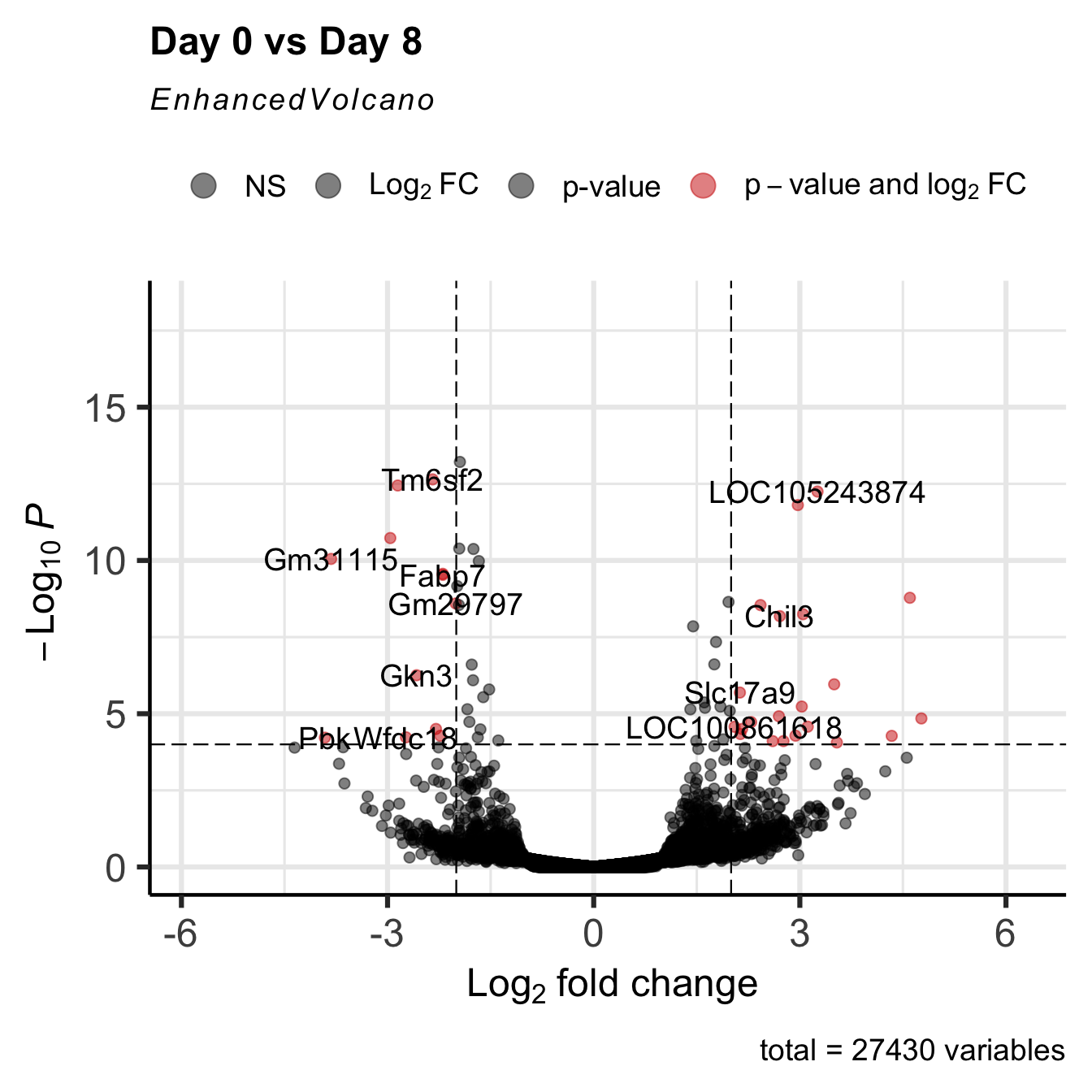 Note that a negative fold change means that the fold change is in the opposite direction: mean(day0) > mean(day8).