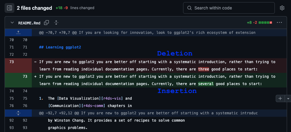 Git only tracks what’s changed between commits (called a diff):