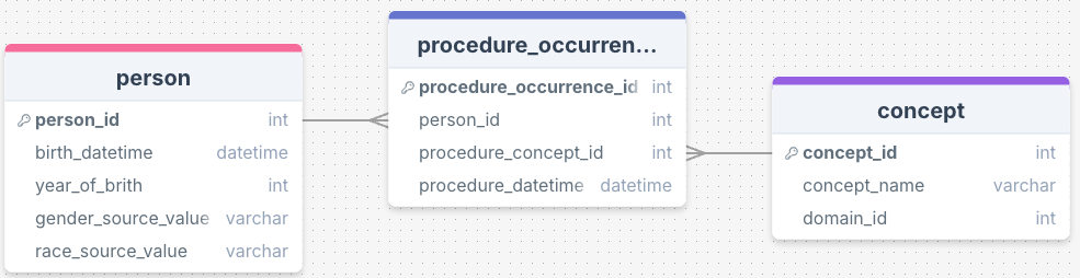 person_idin thepersontable, there may be duplicatedperson_ids inprocedure_occurrencetable, as a patient can have multiple procedures. This is a one-to-many relationship.Multiple elements of